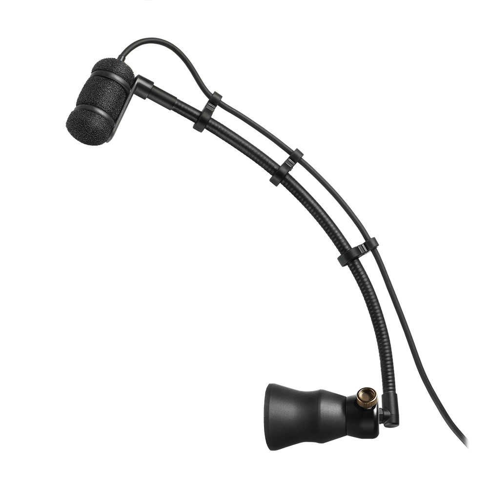 Micrófono cardioide de condensador para instrumento, con sistema de montaje universal (largo): micrófono ATM350a, flexo AT8490L (largo), soporte universal AT8491U, módulo de alimentación AT8543, caja de transporte, soporte velcro AT8468.