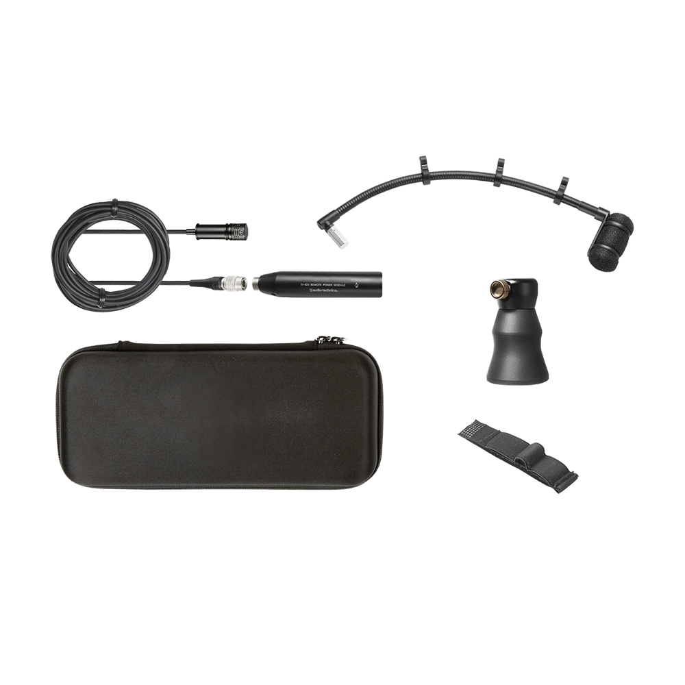 Micrófono cardioide de condensador para instrumento, con sistema de montaje universal: Micrófono ATM350a, flexo AT8490, soporte universal AT8491U, módulo de alimentación AT8543, caja de transporte, soporte velcro AT8468.