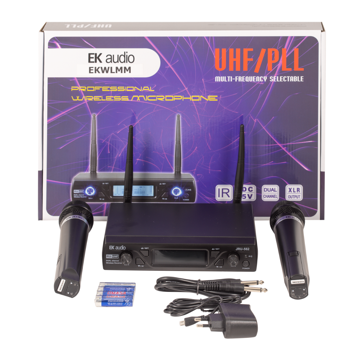EKWLMM MICRÓFONOS INALÁMBRICO MULTIFRECUENCIA (460-970MHz) Sistema Diversity UHF con modulación FM. Control PLL (Phase Lock Loop) Bloqueo de acople. RECEPTOR JRU 562 Pantalla LCD. Salida XLR equilibrado por canal y salida de 1/4 no balanceadas. Sensibilidad de recepción: -90dBm. Ratio señal / ruido: 90dB. Distorsión armónica Total (THD): <1%. Independencia de salida: 300 Ω. Alimentación: 5V DC. Consumo: >300mA. 2 MICROFONOS DE MANO HT-50 Tipo dinámico. Salida de RF:>10dBm. Modulación máxima: 75k. Respuesta de frecuencia: 40Hz – 17KHz. Estabilidad de frecuencia: +/-0 002%. Sincronización por infrarojos. Alimentación: 2 x 1 5V AA. Sistema inalámbrico de 2 x 16 Canales UHF. Con dos micrófonos de mano.