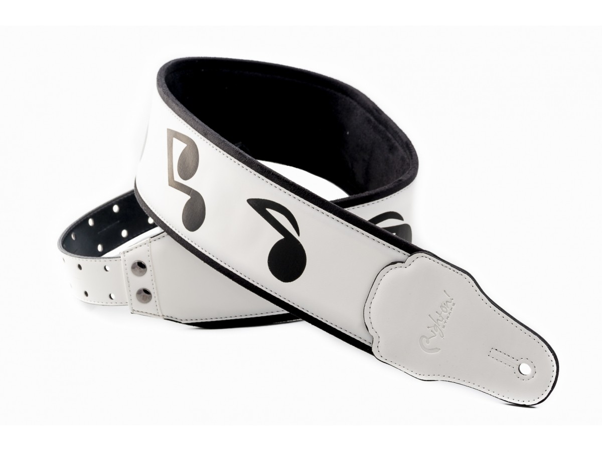 Correa ancha para bajo y guitarra fabricada 100% en España decorada con notas musicales como la que utilizaba Stevie Ray Vaughan SRV. Con sistema de ajuste RAS. Una bandolera que por su anchura resulta muy cómoda en el hombro y para soportar el peso del instrumento.
