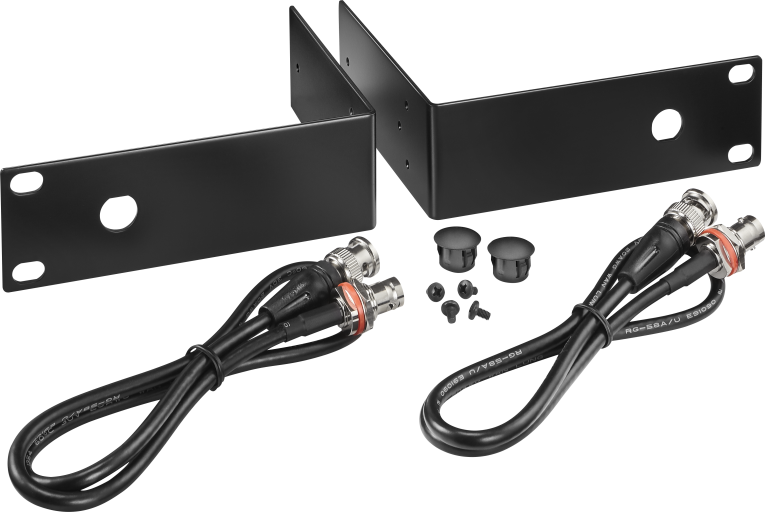 MICROFONO DINAMICO Kit de montaje en rack para un único receptor RE3. Incluye orejas laterales con agujero pasante, cable coaxial con conectores BNC (uno de ellos rocasdo para fijación al agujero pasante).