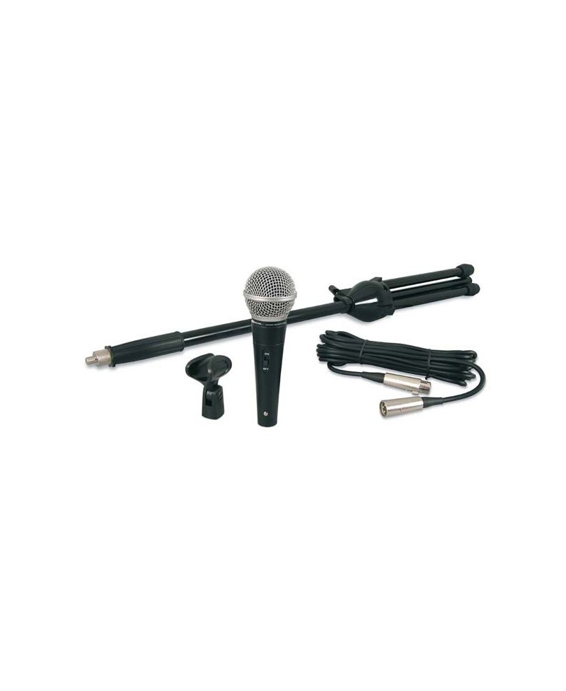 Set de microfonía compuesto por un micrófono dinámico con interruptor ON/OFF y rejilla metálica con antisoplo.