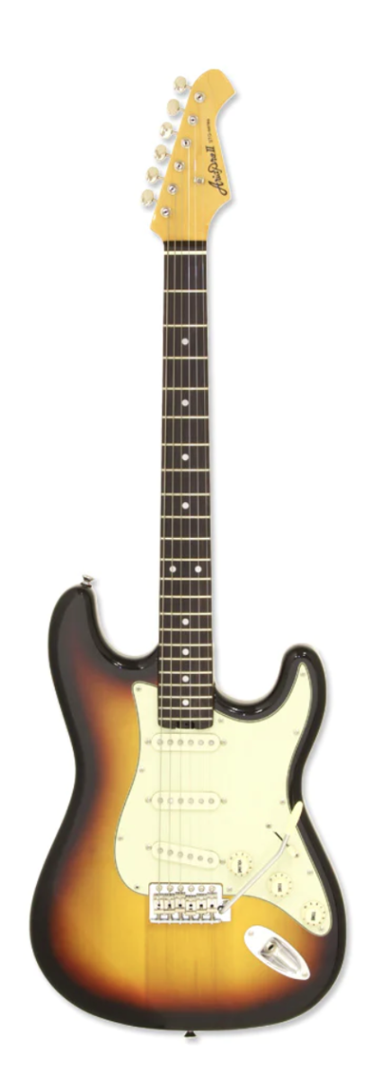 STG623TS TIPO STRATOCASTER Cuerpo: Aliso. Mástil: Arce. Diapasón: Palosanto. Pastillas: OS-5 x 3 (Alnico-5). Acabado: Sombreada. Las imágenes publicadas pueden diferir ligeramente del producto final.