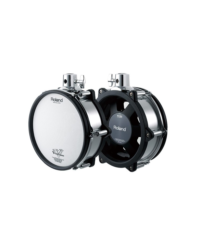 Roland PD 105X V-Pad 10-inch V-Pad provides the same brushed-metal* finish and features as its companion pads, including interchangeable shell-wraps and dual tom-mount options. *Synthetic material with authentic brushed-metal appearance.
